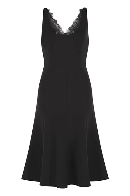 At $119, these wedges are a great option for spicing up a work or date night outfit. For the former, pair with a classic black pencil skirt with a slit, a crisp white button-up and a tuxedo blazer. Choose a sleek, high-top bun or pony for your hair, matte makeup and simple, black lined eyes with a deep red lip to accent the color in the shoes. For date night, pair these wedges with a fit-and-flair LBD like the black ponte dress with lace detailing below by Altuzarra for Target, only $39.99 and still available on www.Target.com. Wear a slightly off-center part for your hair with light volume and ends curled under. Accent the red in the heels with a deep red lip and opt for an elongated cat eye and a pearl eye shadow to brighten the lid. Choose a chandelier earring with gray or black gemstones for jewelry.